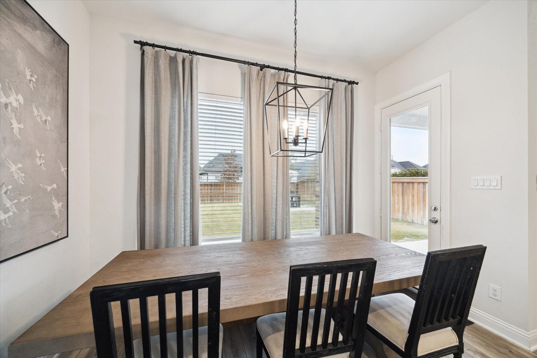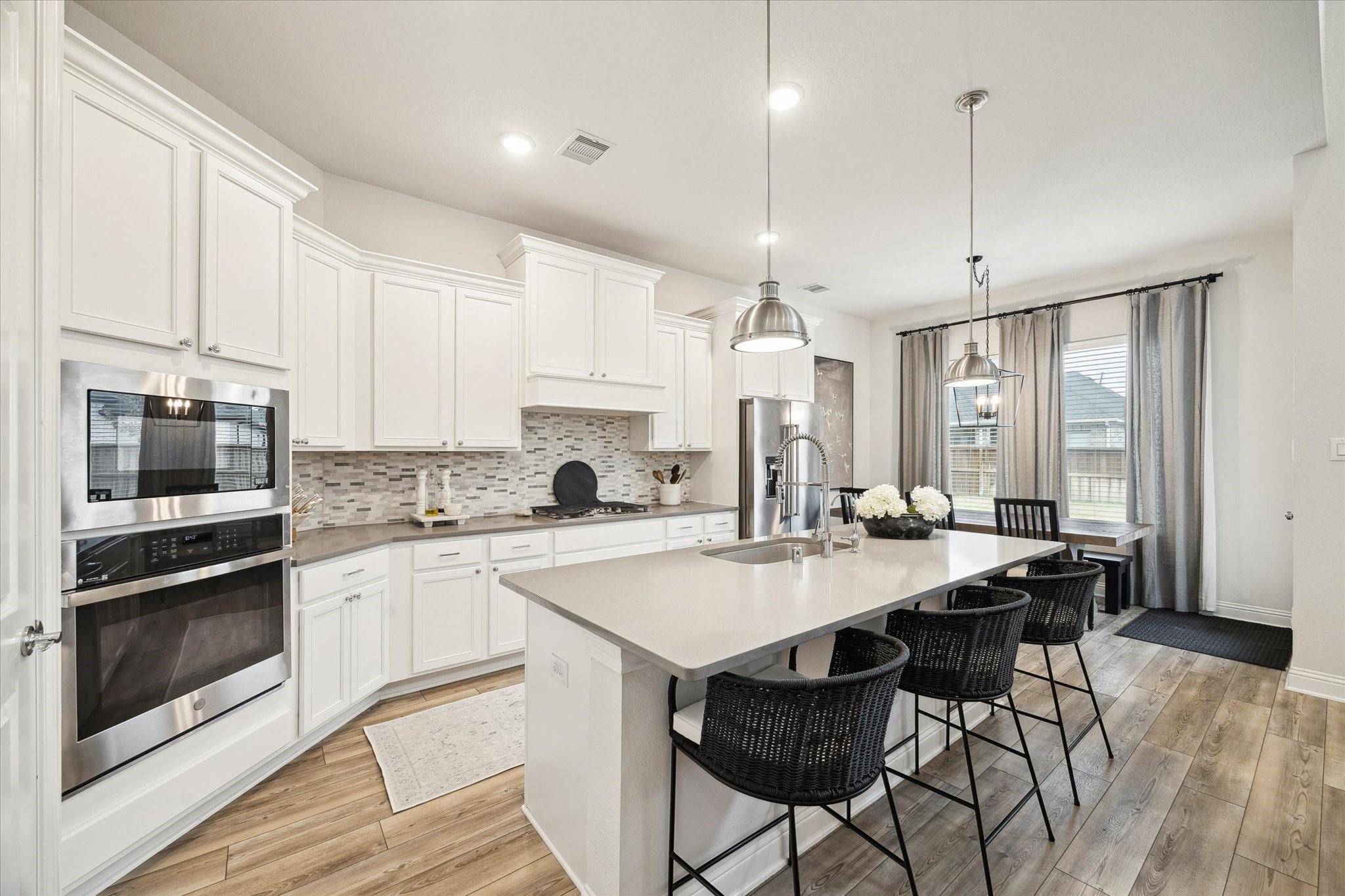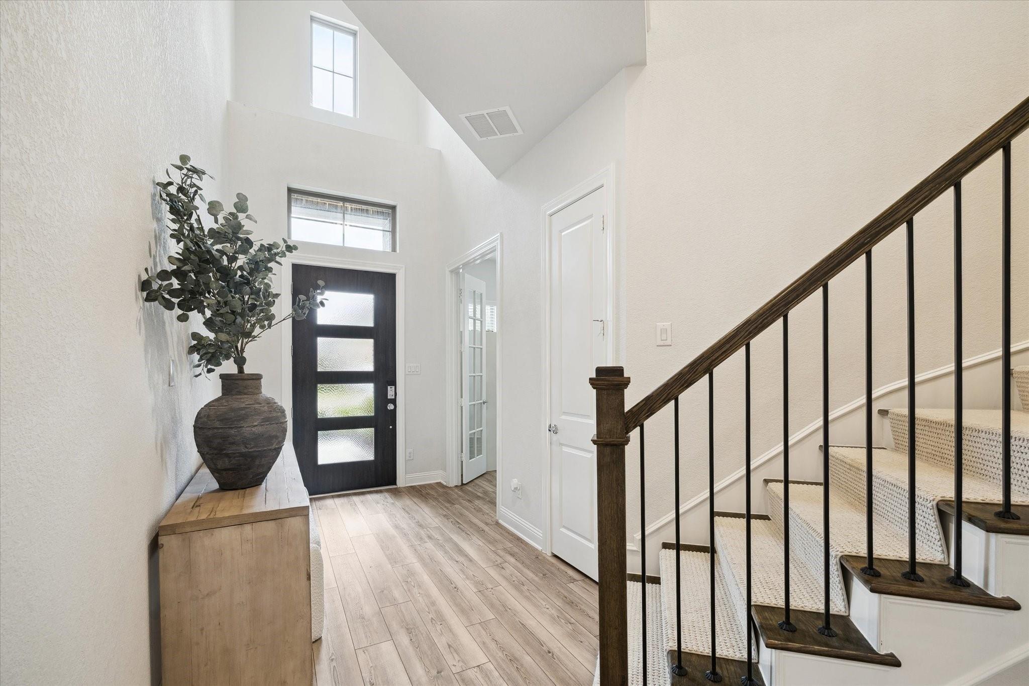 This stunning 4-bed/3.5-bath home in Woodson Reserve features a 3-car tandem garage and a light-filled foyer with soaring ceilings and an elegant curved wood staircase. A private office with French doors, a dramatic two-story living room, and open-concept living with luxury vinyl plank flooring make entertaining effortless. The chef's kitchen offers shaker-style cabinets, a walk-in pantry, an oversized quartz island with seating, stainless-steel appliances, and a 5-burner gas cooktop. The primary suite features a spacious layout for king-size furniture, dual sinks with a soaking tub and glass-enclosed shower, plus a spacious walk-in closet. Upstairs, the game room overlooks the living area. The first-floor powder bath, mudroom with built-ins, and bright laundry room add convenience. Outside, enjoy a covered patio with a gas hookup and a sprinkler system. Residents have access to lakes, a resort-style pool with a lazy river, fitness center, playgrounds, dog parks, and nature trails.