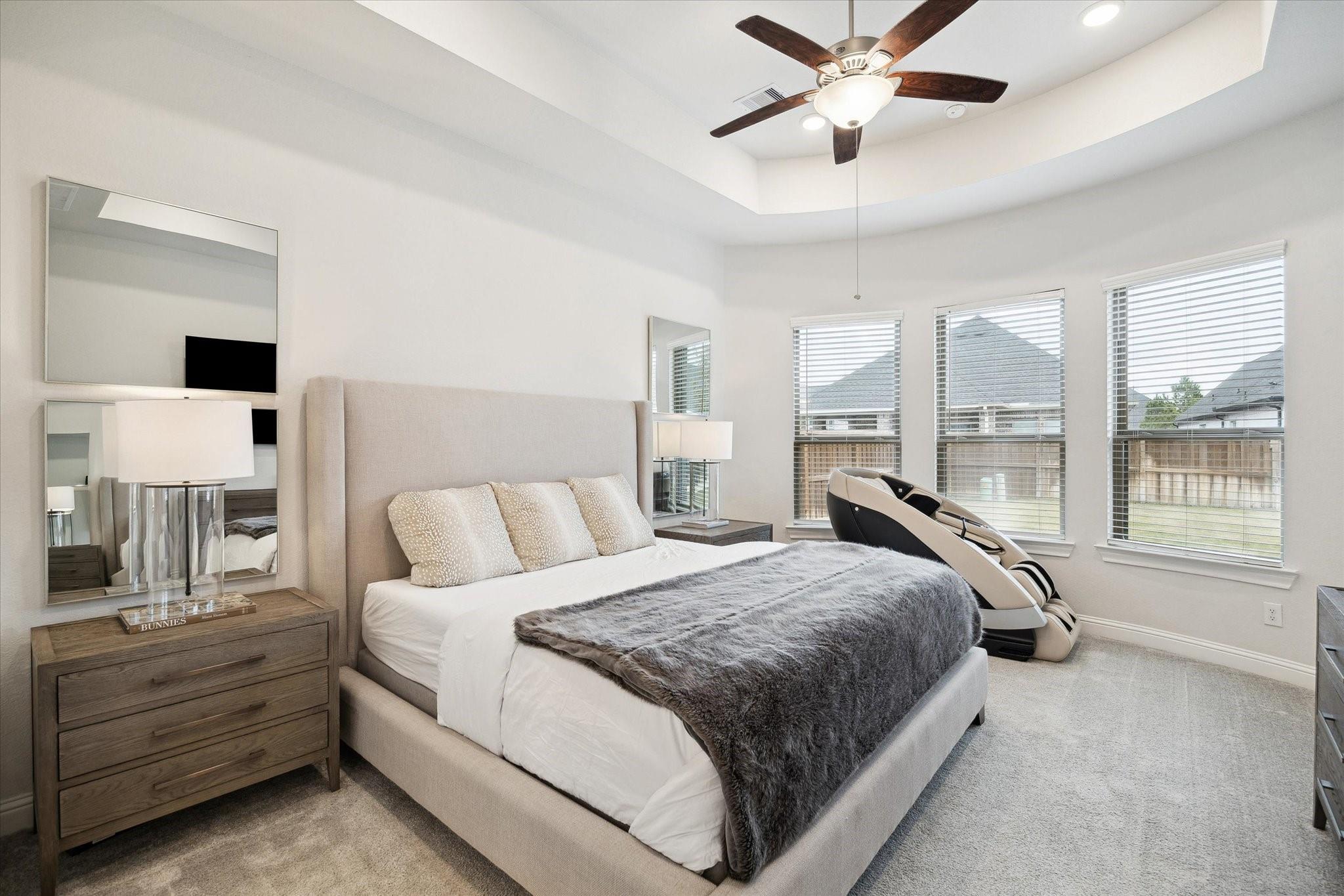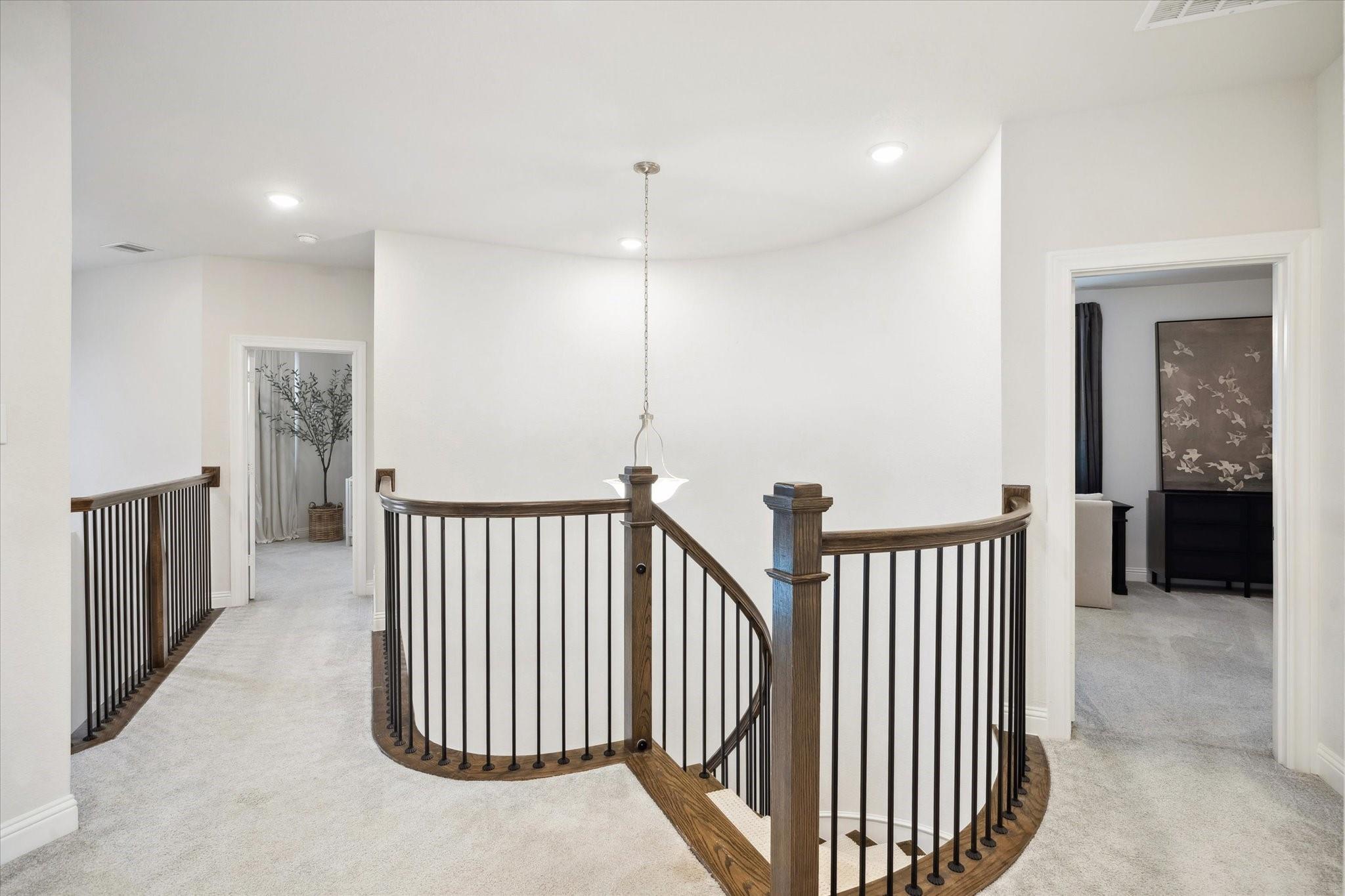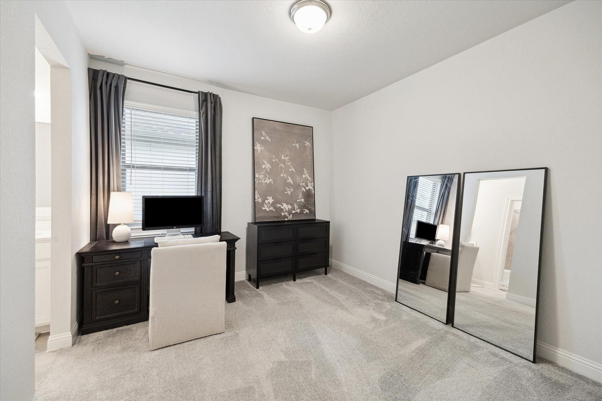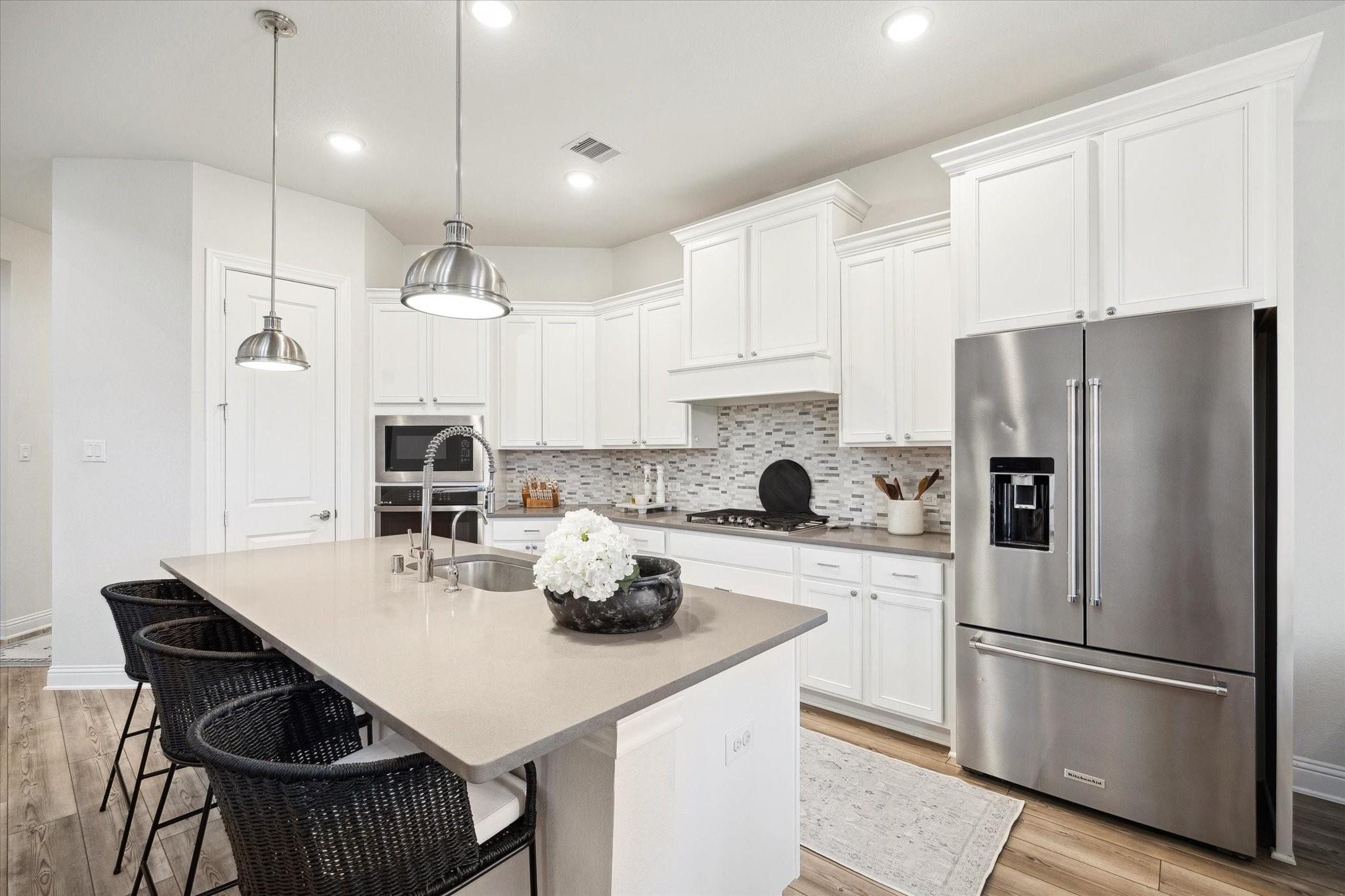 This stunning 4-bed/3.5-bath home in Woodson Reserve features a 3-car tandem garage and a light-filled foyer with soaring ceilings and an elegant curved wood staircase. A private office with French doors, a dramatic two-story living room, and open-concept living with luxury vinyl plank flooring make entertaining effortless. The chef's kitchen offers shaker-style cabinets, a walk-in pantry, an oversized quartz island with seating, stainless-steel appliances, and a 5-burner gas cooktop. The primary suite features a spacious layout for king-size furniture, dual sinks with a soaking tub and glass-enclosed shower, plus a spacious walk-in closet. Upstairs, the game room overlooks the living area. The first-floor powder bath, mudroom with built-ins, and bright laundry room add convenience. Outside, enjoy a covered patio with a gas hookup and a sprinkler system. Residents have access to lakes, a resort-style pool with a lazy river, fitness center, playgrounds, dog parks, and nature trails.